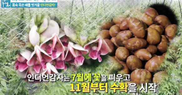 정식학명은 아피오스로 불리며, 우리나라에서는 인디언감자 혹은 작은 생김새 때문에 콩감자로도 불립니다. 우리가 흔히 먹는 감자는 5월말~7월 정도에 수확하는데 비해, 인디언감자는 11월부터 수확을 시작합니다.