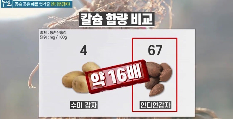 인디언감자에는 일반감자에 비해 무려 30배가 넘는 칼슘이 함유되어 있습니다. 칼슘은 잘 아시다시피 뼈를 구성하는데 중요한 성분으로, 칼슘이 부족하면 골다공증 및 관절염의 위험이 커지게 되는데요. 인디언감자 속 풍부한 칼슘은 보다 뼈를 튼튼하게 하는데 도움이 됩니다.